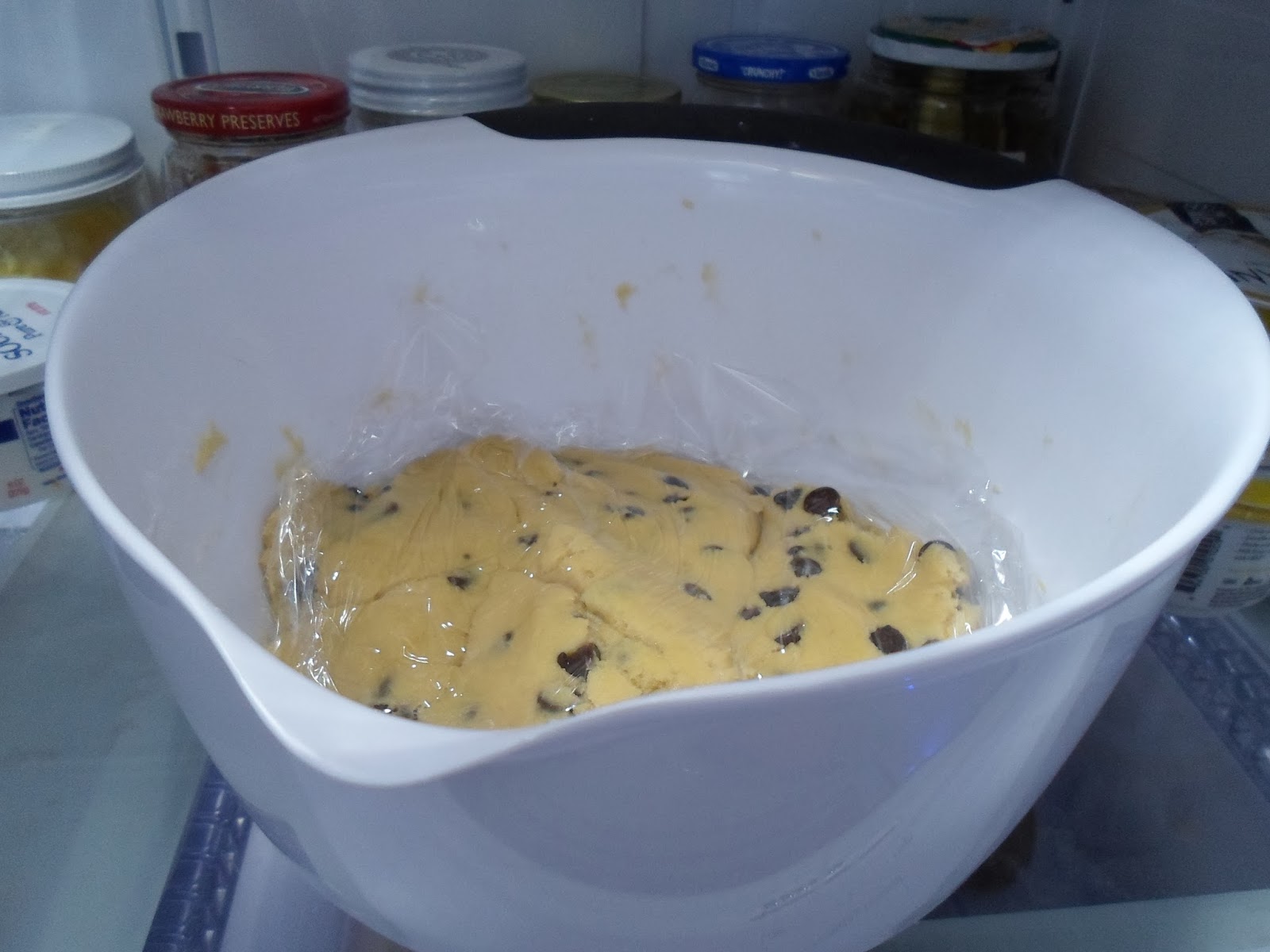 So now, take it out of the fridge, and let it sit for about ten minutes so it's not too cold to handle. Roll bits of dough into balls. I just wing this part. The recipe says 3 tablespoons worth of dough, but I just wing it, and the same baking time worked regardless. I'm too lazy to measure out balls of dough.